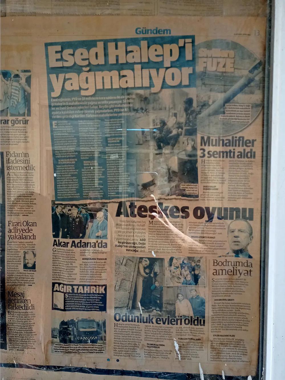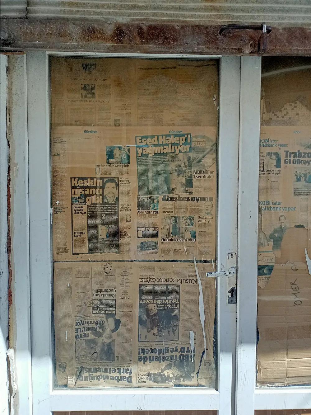 “Esad Halep’i Yağmalıyor” manşeti Antakya kısmındaki bir camda asılı. 2014 yılına kadar Antakya adlı tek bir ilçeden oluşan şehir merkezi, 2014 yılında Arap Alevisi nüfusun hukuki olarak Defne isimli ilçe altında tanımlanmasıyla — neredeyse homojen — Sünni bir yapı alıyor. Yani bu gazete Defne’de değil, Antakya’da asılı bir gazete. Yeni tanımlanmış Defne ise 2013 yılında gerçekleşen Gezi Parkı protestolarının en yoğun olduğu Armutlu mahallesine ev sahipliği yapan bölge. Aynı zamanda Esed ile aynı kültürel-etnik gruba aidiyet hissi barındırıyor bu bölgedeki insanlar. Yasal ayrım yapıldıktan (2014) sonraki bir tarihe (2016) ait bu gazete sayfası, belki de bölgedeki kutuplaşmayı ve Suriye’de yaşananlara dair farklı ve birbiriyle mücadele eden perspektifler arasını daha da derinleştiriyor. Bir açıdan kamusal alana bir mesaj veriyor, bu bölgede kamusal alandaki düşüncenin ne olduğunu gösteriyor. Çünkü hatırladığım kadarıyla bu gazete sayfaları, kullanılmayan bir dükkanın camında asılıydı. Eskimiş sayfalarına rağmen altı yıldır asılı olma ihtimali olan bu sayfanın indirilmesi için herhangi gerek duyulmamış veya indirilmesine yönelik bir tepki de almamış.