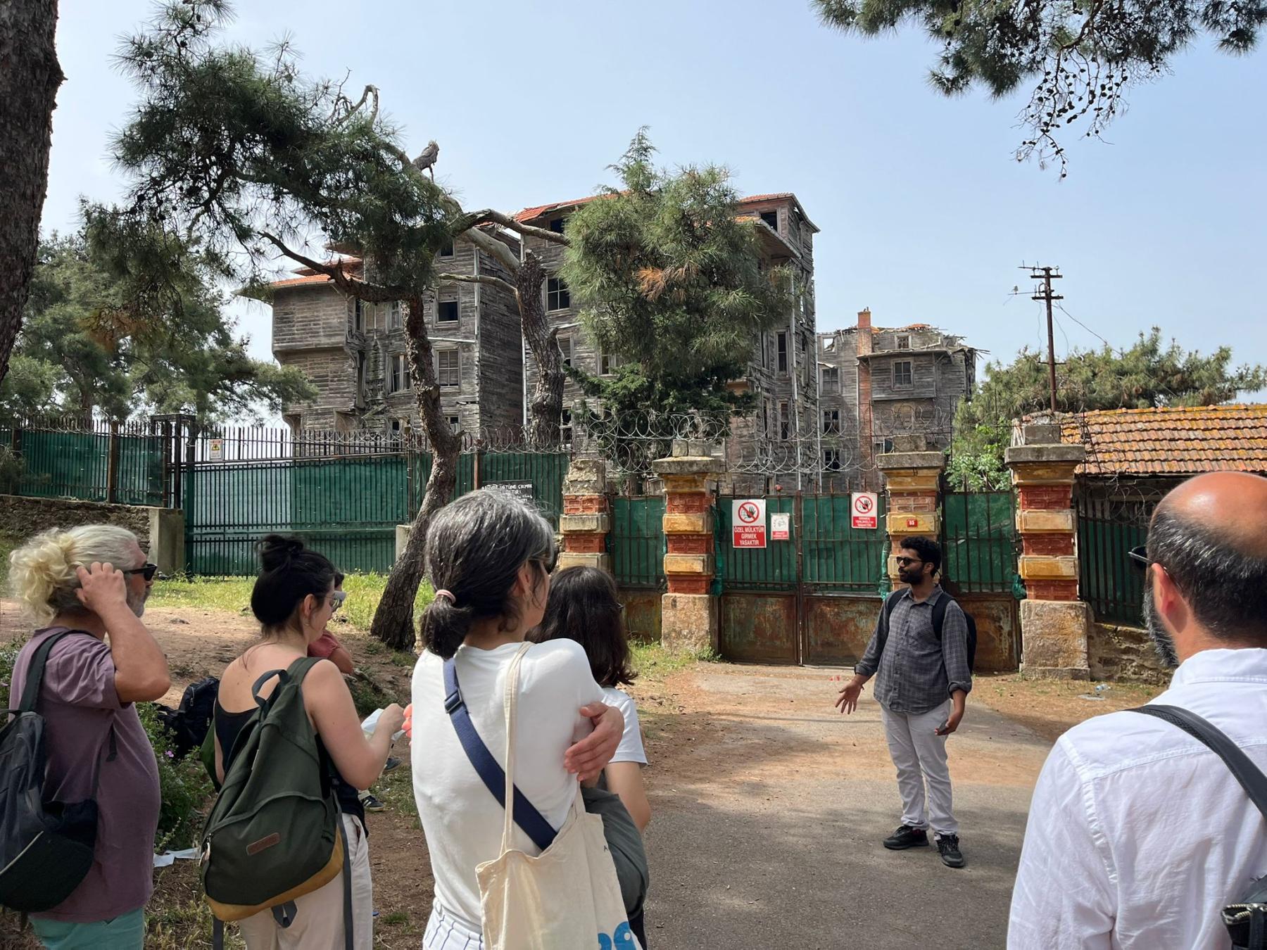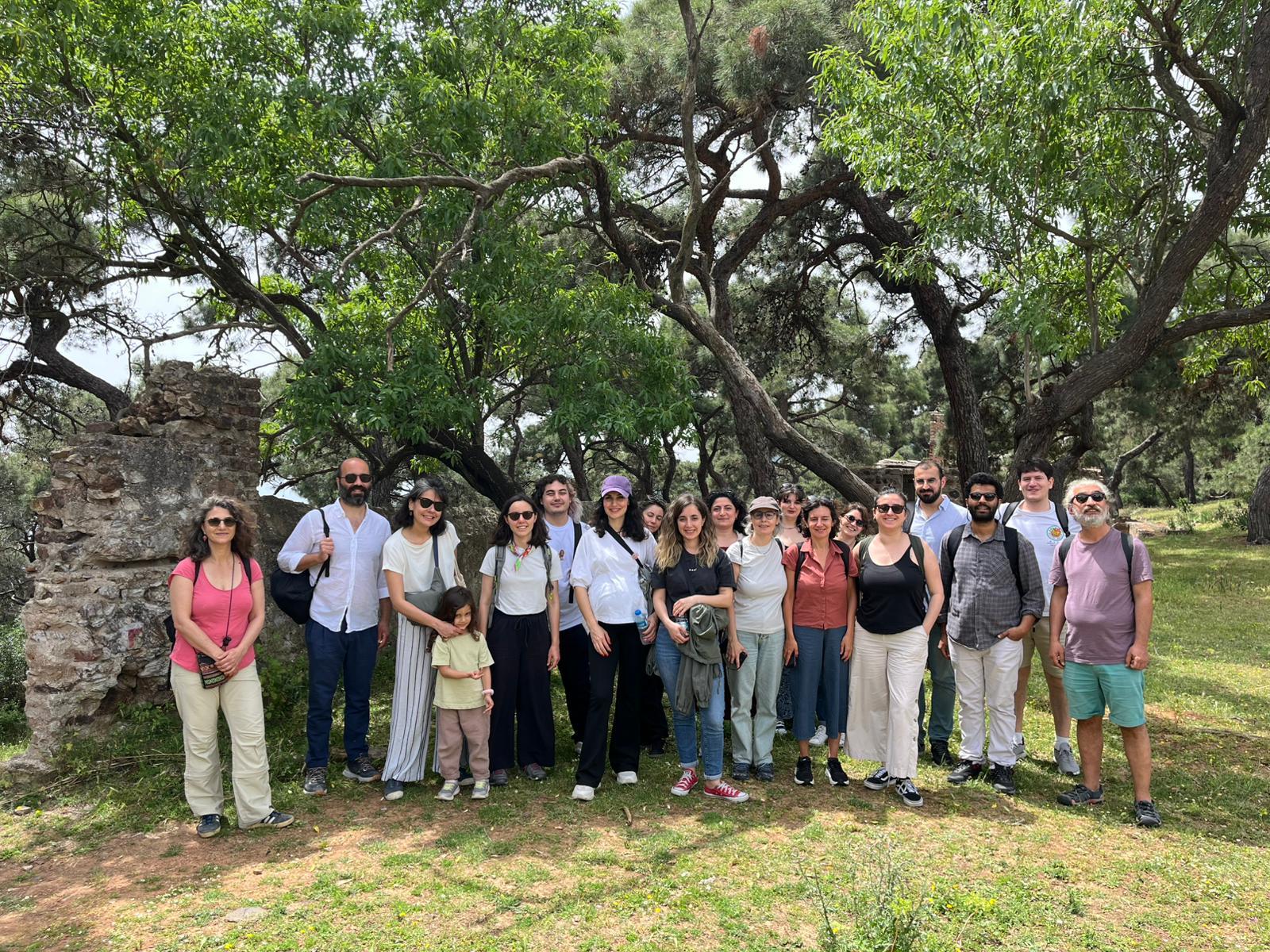 Güzergâhımız, adanın tarihsel katmanlarını barındıran ve en yüksek ikinci noktası olan Hristos Tepesi çevresindeydi. Yürüyüşe Büyükada Rum Yetimhanesi’nin önünden başladık. Waseem Ahmad Siddiqui, Umut Azak, Noémi Lévy-Aksu ve Mert Koçak’ın anlatılarıyla Hıntıryan Köşkü, Hristos Gazinosu, Hristos Manastırı ve Kilisesi’ni ziyaret ettik. Ardından İstanbul’un ilk ve tek kent müzesi olan Adalar Müzesi’ne geçerek sergiyi ayrıntılı biçimde gezdik. Müzenin kuruluşunu, kürasyon sürecini ve gelecekteki enstalasyon planlarını Ali Erkurt, Asu Aksoy ve Cihan Yiğin’den dinledik. Böylece deneyimsel hafıza pratiğimizi müzenin kurumsal anlatısıyla diyaloğa sokarak yürüyüşümüzü tamamladık.