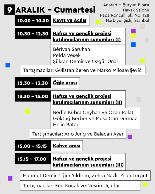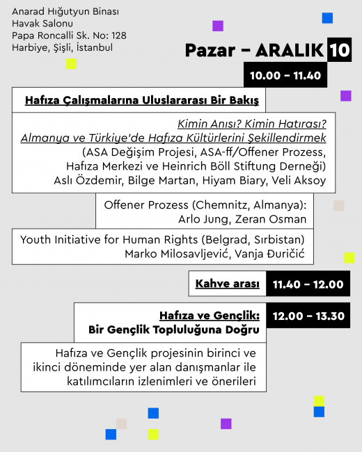 9 ve 10 Aralık 2023 tarihlerinde, Türkiye’de ve dünyada sağ ideolojilerin saldırganlıklarının giderek arttığı bir dönemde, gençlerin farklı direnç, direniş ve karşı anlatı geliştirme yollarını tartıştığımız “Yeni Hafıza Sahaları: Gençlere Alan Açmak, Uluslararası Diyaloğu Gücülendirmek” başlıklı uluslararası bir çalıştay düzenledik.