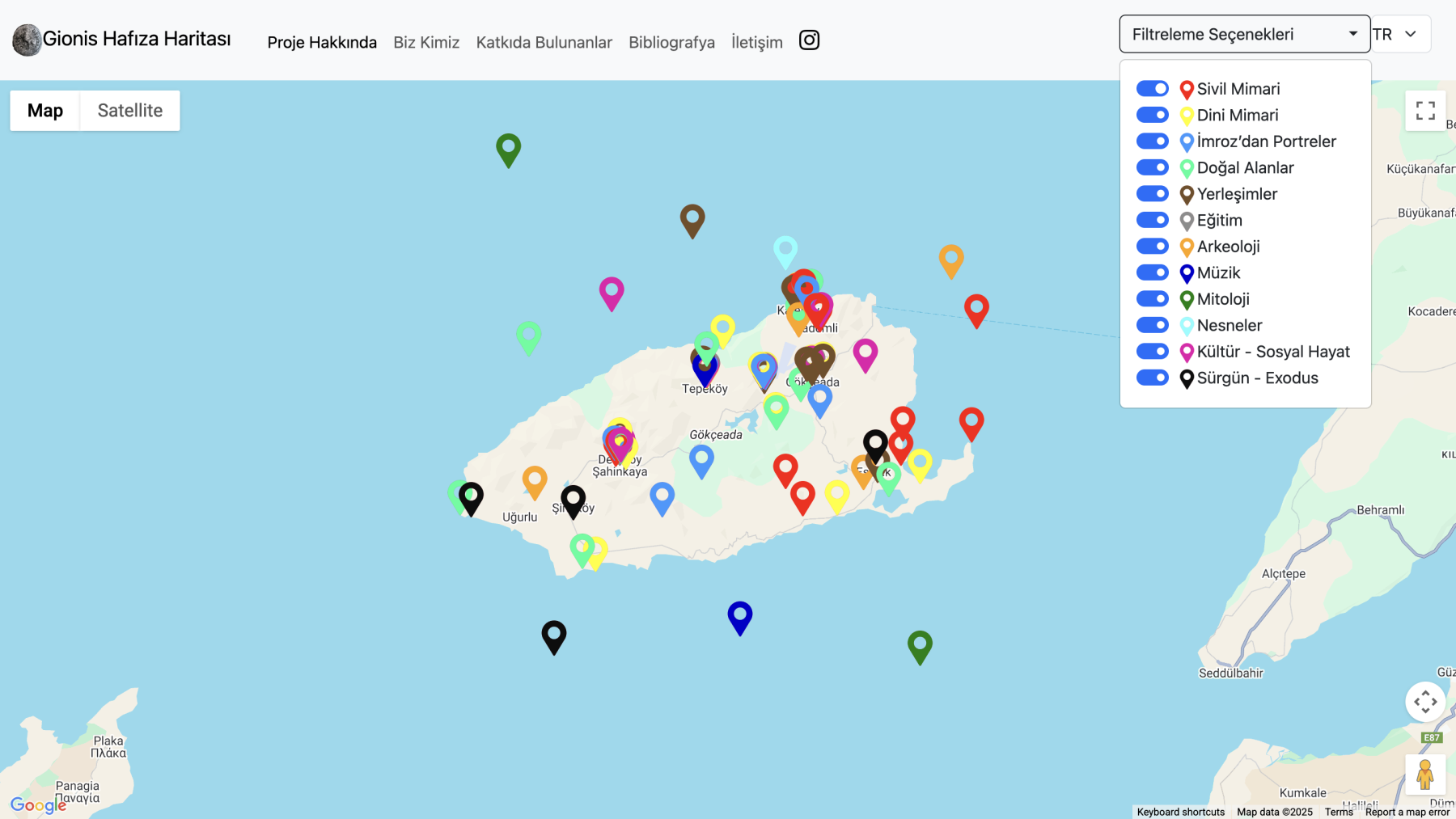 Bu proje İmroz’un (Gökçeada) kültürel ve tarihi hafızasını görünür kılmayı amaçlayan dijital bir bellek haritası ve arşivdir. Mekân, insan, dil, müzik, mimari ve ritüeller gibi pek çok unsurun bir araya getirilmesiyle oluşturulan bu harita; belge, tanıklık, sözlü anlatı ve görsel materyallerle sürekli olarak zenginleştirilmiş, İmroz'a dair kapsamlı bir arşiv haline gelmiştir.